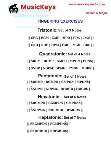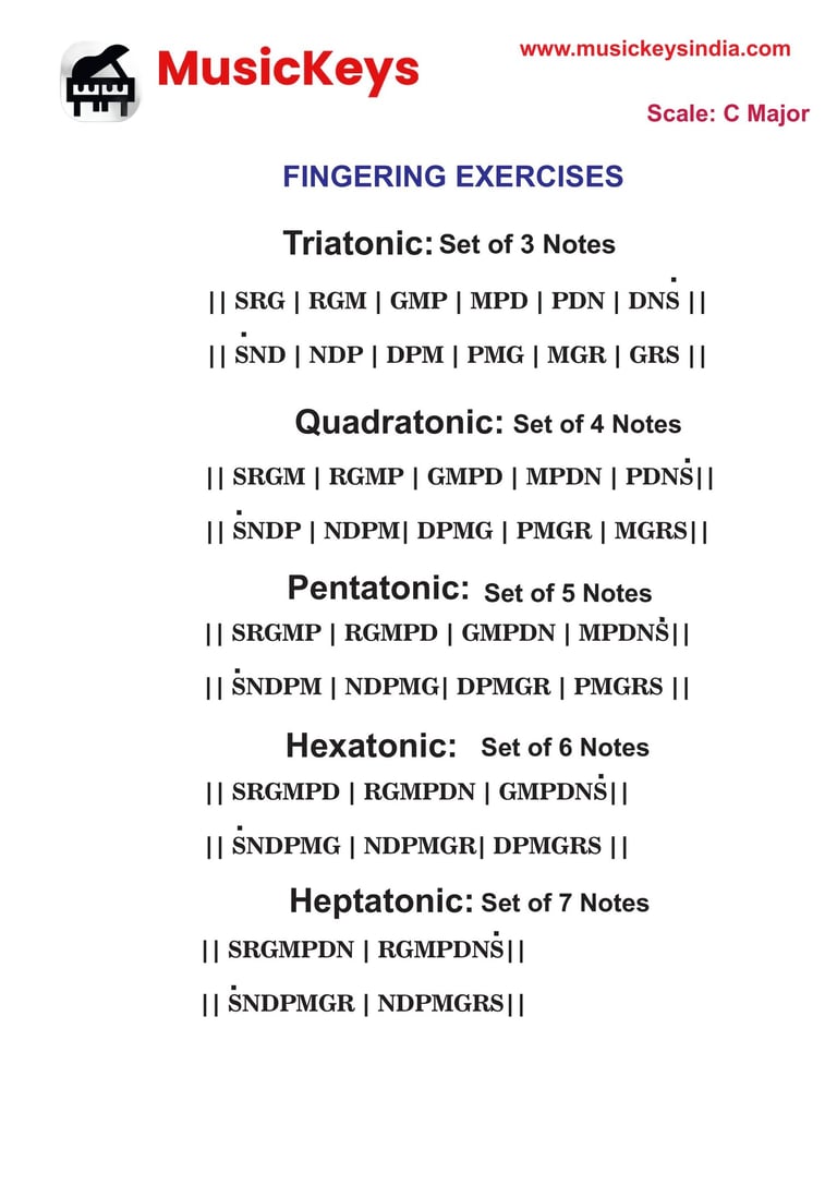 The Piano / musical keyboard Exercises given below are essential. You can play it on a C Major Scale. It gives strength to the fingers. It also provides more flexibility in identifying the musical notes better. These exercises can be practiced for speed development. The exercise is named a set of notes. A set of 3 notes is called a Tri-tonic, a Set of 4 is Quadra tonic, a set of 5 is pentatonic, a set of 6 is hexatonic, and a set of seven is heptatonic, respectively. These piano exercises can be played as warm-up exercises, which ease your fingers and develop flexibility. It’s very effective and can be practiced every day. Take one exercise at a time. Play very slowly. Repeat playing till you are comfortable playing without looking at the musical notes.
